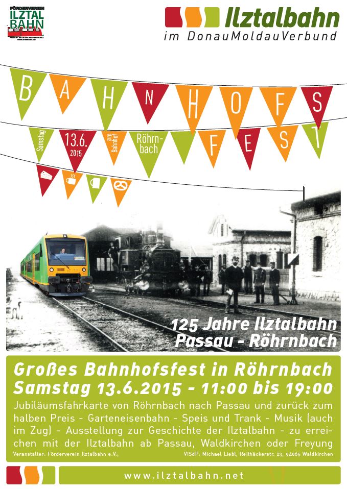 Vor 125 Jahren wurde der Streckenabschnitt Passau-Röhrnbach eröffnet. Zu diesem Jubiläum feiert der Förderverein Ilztalbahn am 13.6. in Röhrnbach ein großes Bahnhofsfest mit: