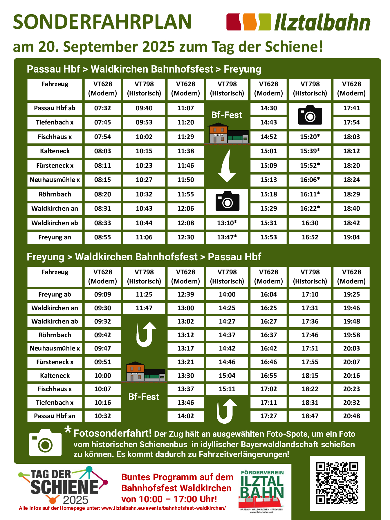 Zusätzlich zum normalen Fahrplan der Ilztalbahn fährt der Schienenbus der Passauer Eisenbahnfreunde. Für Eisenbahnfans gibt es eine spezielle Fahrt mit Fotohalten – Fahrplan hier.